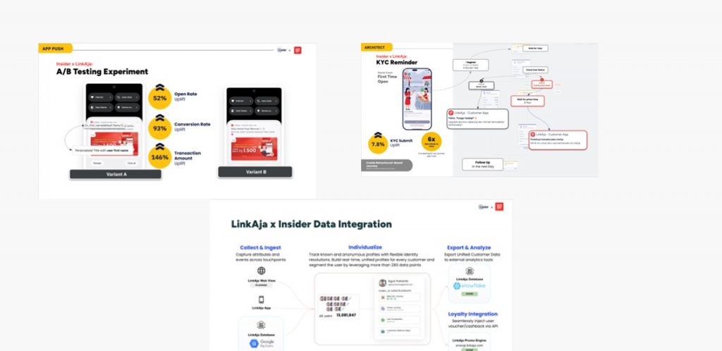 LinkAja, a leading Indonesian financial services platform, partnered with Insider to overcome challenges in data fragmentation and campaign personalization. By leveraging Insider’s Customer Data Platform, Predictive Audience, and A/B Testing tools, LinkAja unified its customer data, streamlined marketing processes, and delivered highly targeted campaigns. In just one month, LinkAja achieved a 146% uplift in transaction amount, a 93% conversion rate, and a 7.8% increase in KYC submissions, driving substantial business growth.