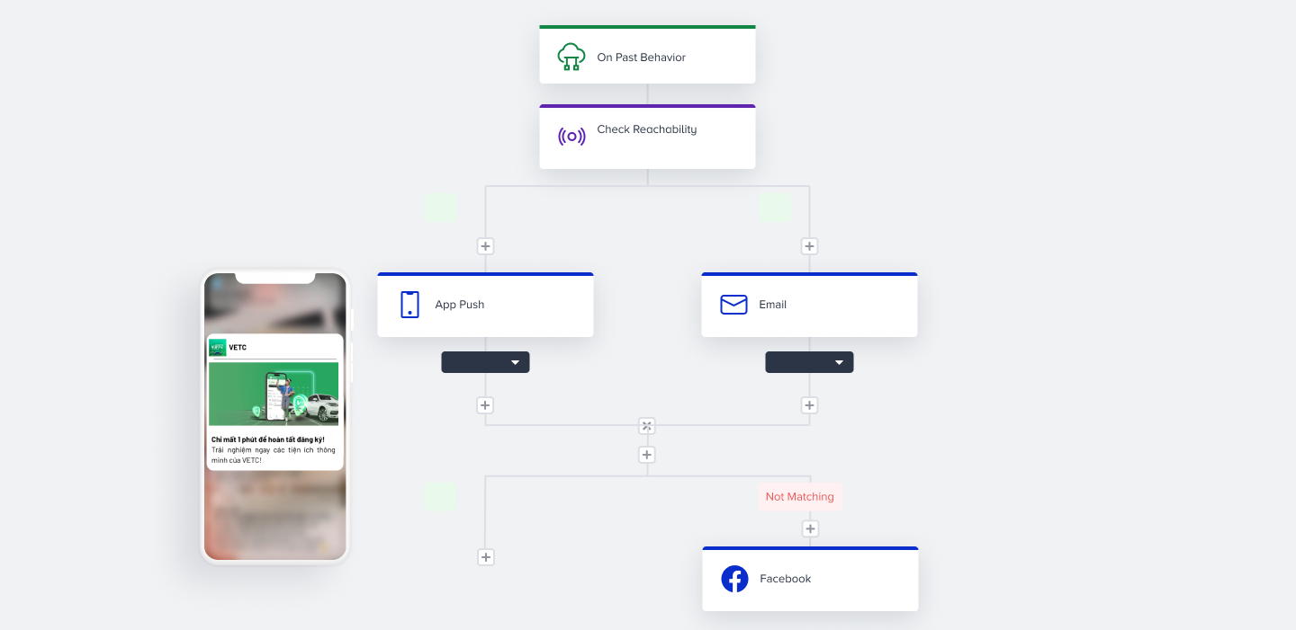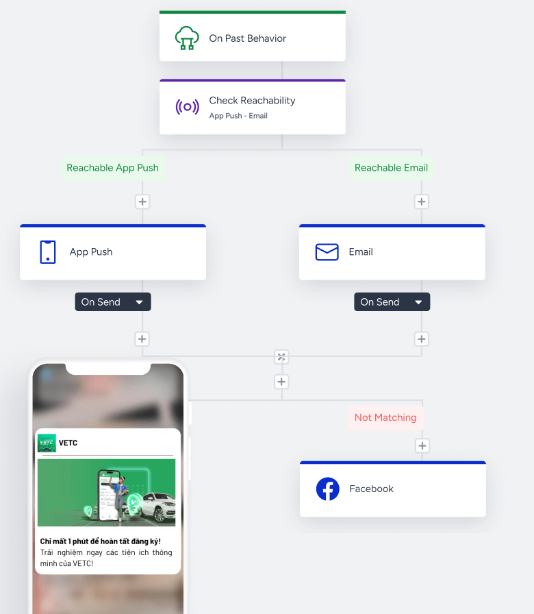 Using Insider’s Architect, VETC built automated, multichannel journeys that targeted every critical moment in the user lifecycle. This included sending reminders to users who downloaded but didn’t register, nudges to those who completed eKYC but hadn’t linked their wallet, and re-engagement messages to inactive users. All communications—via push notifications, in-app messages, and email—were triggered by real-time user behavior.